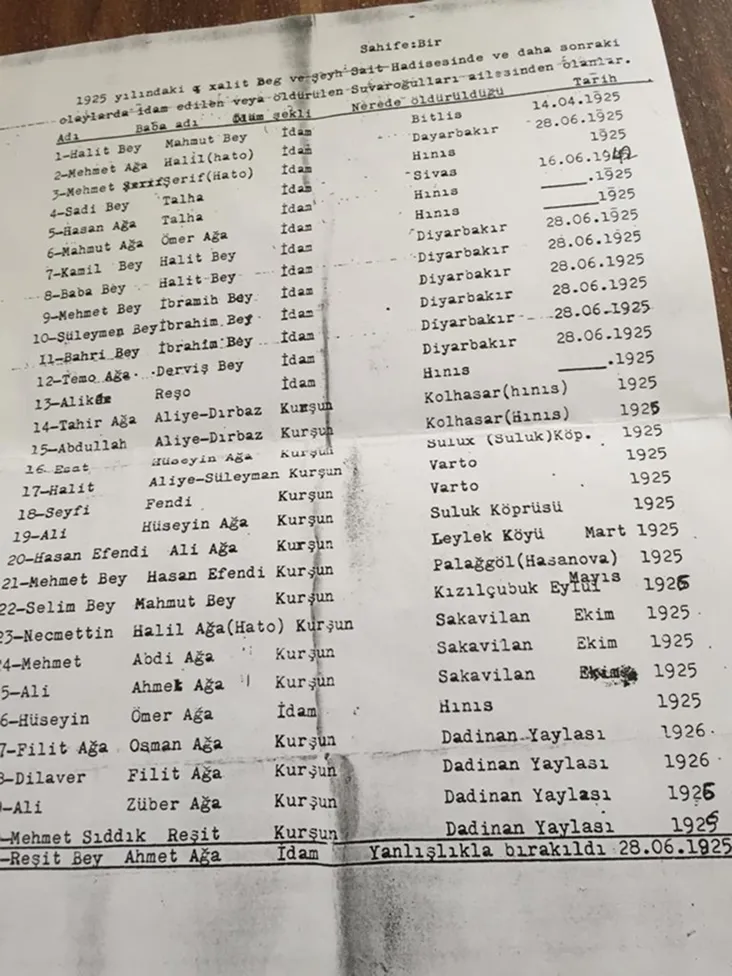 Kasım Demiralp, erken Cumhuriyet yıllarında, özellikle 1925 ve sonrasında, idam edilen ya da çeşitli biçimlerde katliama uğratılan geniş ailesi ve akrabalarına ilişkin isimleri tespit etmeye yönelir. Bu kişilerin hangi şehir, kasaba ve köylerde yaşadıklarını, hangi mahkemelerde yargılandıklarını, nerede ve nasıl öldürüldüklerini araştırır. Demiralp, devlet tarafından farklı kentlerde kurulan Şark İstiklal Mahkemeleri’nde idam edilen ve coğrafyanın çeşitli bölgelerinde katledilen akrabalarından, o tarihte ulaşabildiği bilgiler doğrultusunda 41 kişiyi tespit eder. Topladığı verileri tasnif ederek, kayıpların adlarını, baba adlarını, ölüm biçimlerini, yer ve tarih bilgilerini ayrı sütunlar halinde kayda geçirir. Hazırladığı bu listenin bir nüshasını arşivinde muhafaza eder, diğer nüshaları ise bölgedeki akrabalarına ve bu döneme ilgi duyan kişilere ulaştırır.